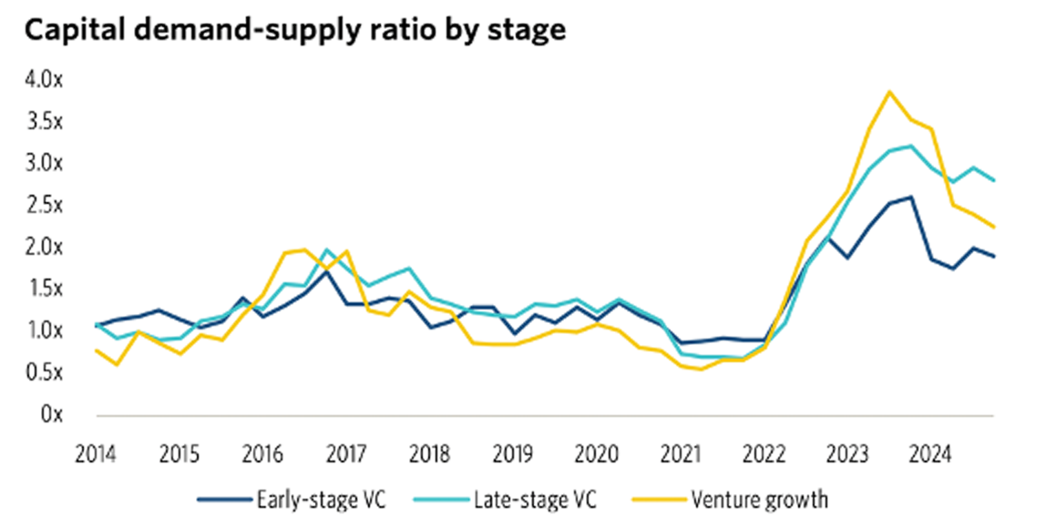 However, late-stage funding remains constrained. Between 2016 and 2020, late-stage companies sought about 20% more financing than was available—a gap that widened significantly to a 3.5:1 demand-to-supply ratio by 2023. This imbalance has created challenges for companies seeking growth capital, as investors adopt a more cautious approach to capital deployment.
